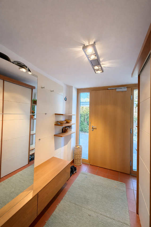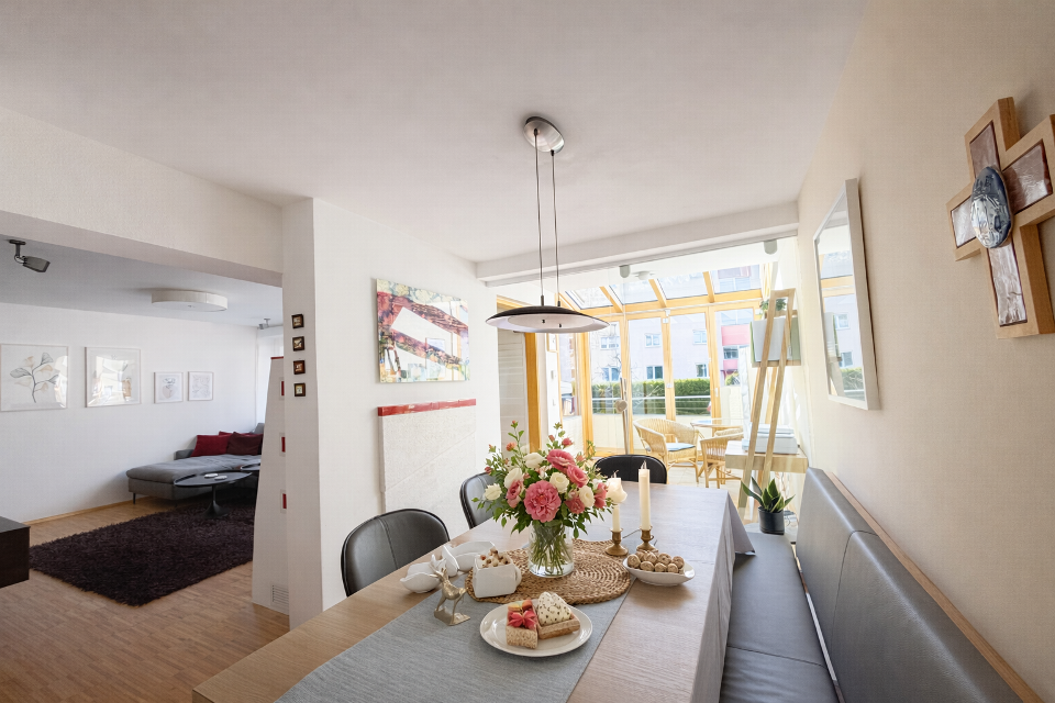Schon beim Betreten spürt man die durchdachte Struktur und die angenehme Wohnatmosphäre. Der lichtdurchflutete Wintergarten erweitert den Wohnbereich und schafft einen fließenden Übergang in den Garten, ein idealer Ort zum Entspannen.